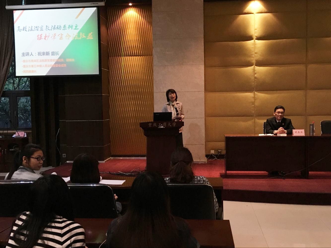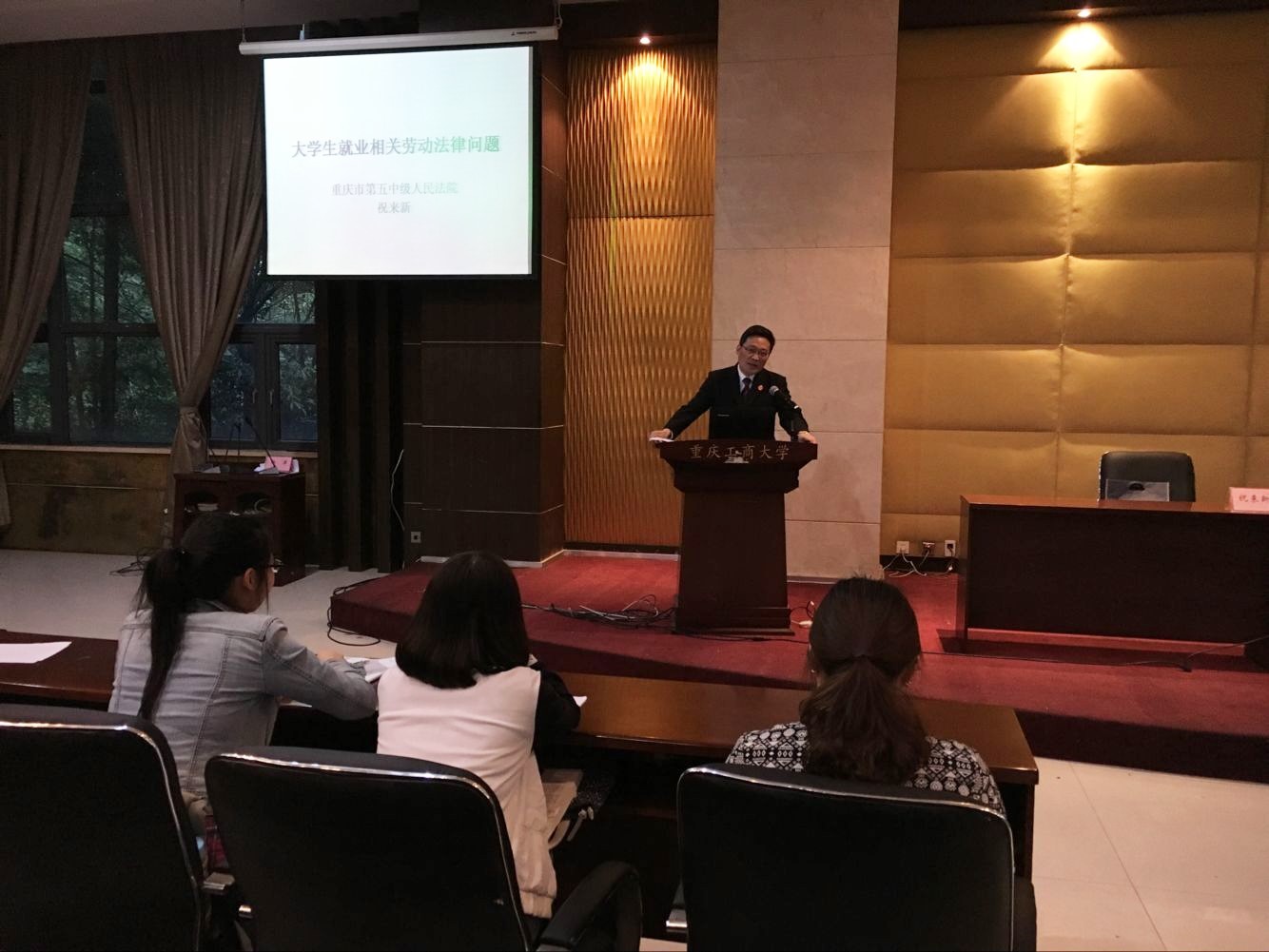 2016年4月26日晚,高校法治宣教活动系列之保护员工合法权益法律讲座在田家炳书院408报告厅成功召开。重庆市南岸区法院原党委组织成员、副经理,重庆市第五中级人民法院省委会成员、民四庭庭长祝来新;原重庆市南岸去法院副经理、原重庆市第五中级人民法院宣教处副处长陈绍惠受邀就老员工就业相关劳动法律问题进行知识宣讲。财政总支杨萍书记、分团委徐阔书记、员工联络员杨佳妮及员工代表张明佳出席了本次讲座。