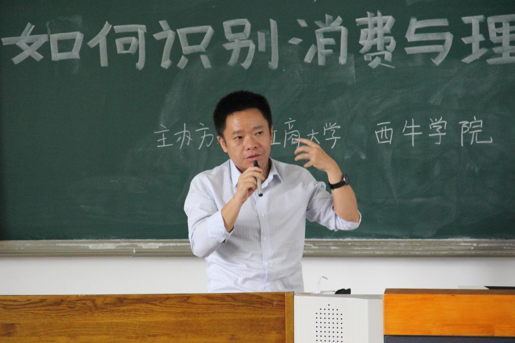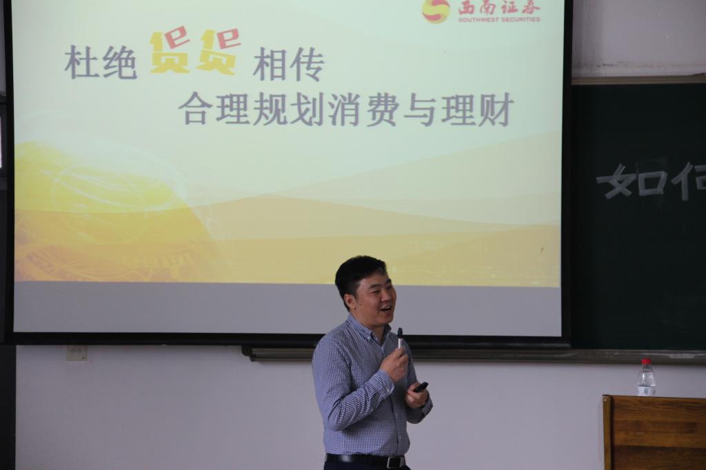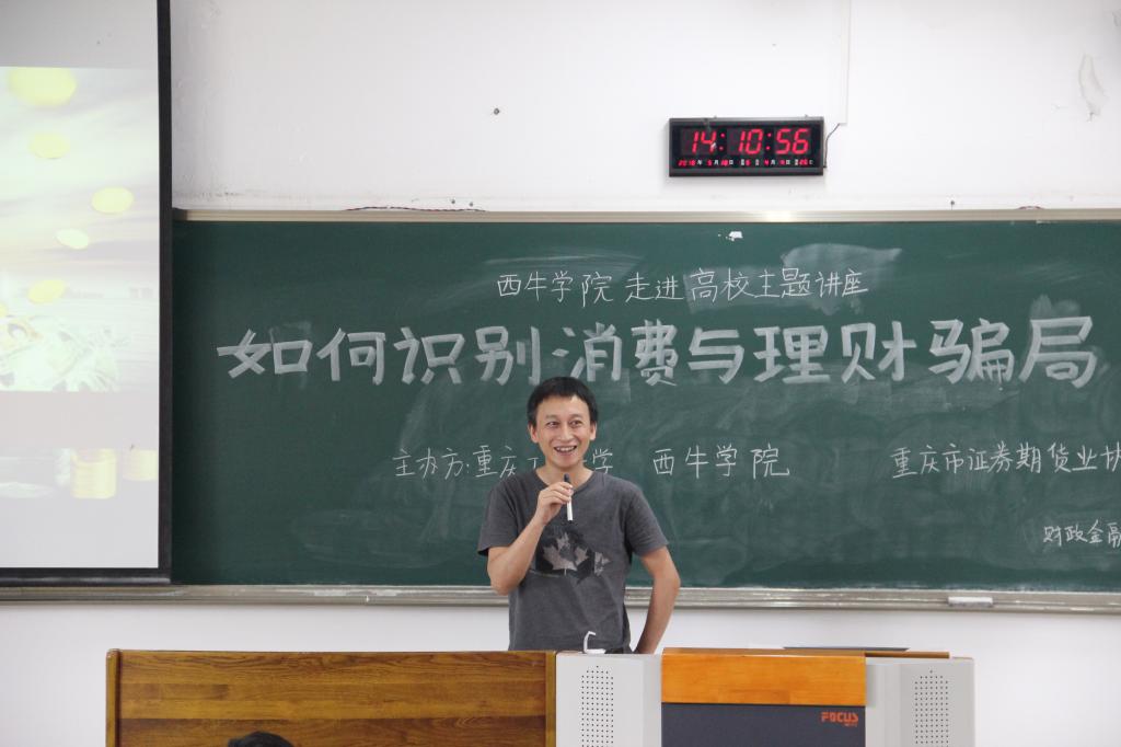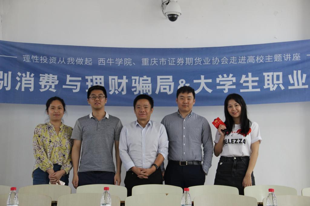 为使老员工了解金融市场风险、提高识别金融骗局的能力,同时为老员工提供就业规划、职业发展的指导与建议,5月18日下午2点,西南证券国家级互联网投教基地“西牛学院”、重庆市证券期货业协会和伟德国际1949始于英国财政伟德国际1949在博智楼207联合举办了“如何识别消费与理财骗局暨老员工职业发展交流”的主题讲座。西南证券财富管理中心副总经理张涛、西南证券财富管理中心产品经理黄立龙、重庆市证券期货业协会培训部主任朱佳、财政伟德国际1949分党委副书记黄谦以及学团办主任兰丽娟作为嘉宾莅临了本次讲座。