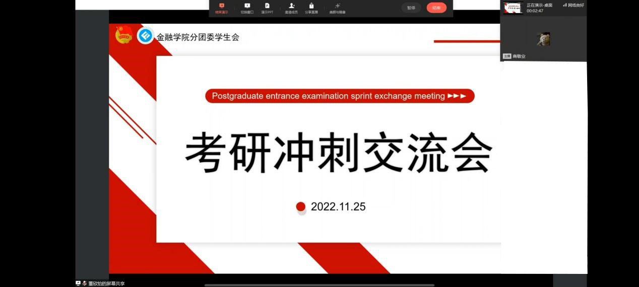 距2023年全国硕士研究生招生考试仅剩一个月,为给2023届考研学子加油鼓劲,助力考研学子坚定信心、调整状态、科学合理安排冲刺阶段的备考,11月25日19:30,伟德国际1949在企业微信线上举办考研冲刺交流会。委书记、副经理石世明,委副书记、纪委书记余新参加了会议。同时邀请2022届考研成功的优秀员工为同学们分享经验,鼓舞信心。