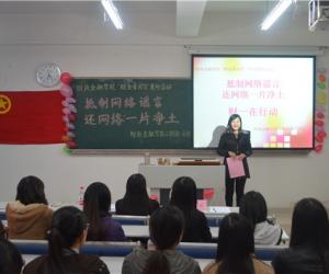在慷慨激昂的共青团团歌中,团学活动正式开始。开场视频首先呈现了当今网络谣言滋生蔓延的现象,让大家对网络谣言有了初步的认识。演讲《谣言止于责任》则为同学们形象地展示了颇为混乱的网络现状,并传达了造谣、传谣的极大危害。诙谐幽默的小品、活力四射的舞蹈、青春向上的歌曲让现场气氛迅速升温,在轻松欢乐的氛围中提高了同学们冷静判断、理性发言、文明上网的意识。活动最后,与会师生进行了庄严的宣誓,决心明辨是非真假,杜绝网络谣言,为创建文明、和谐的网络环境尽己之力。伴随着再次响起的团歌,整个活动画上圆满的句号。兰丽娟老师在总结发言中表示,无论是教室布置还是环节设置,均体现了同学们较高的组织策划能力;精心安排的节目则将净化网络的主题渗透其中,充分体现了本次活动的意义。