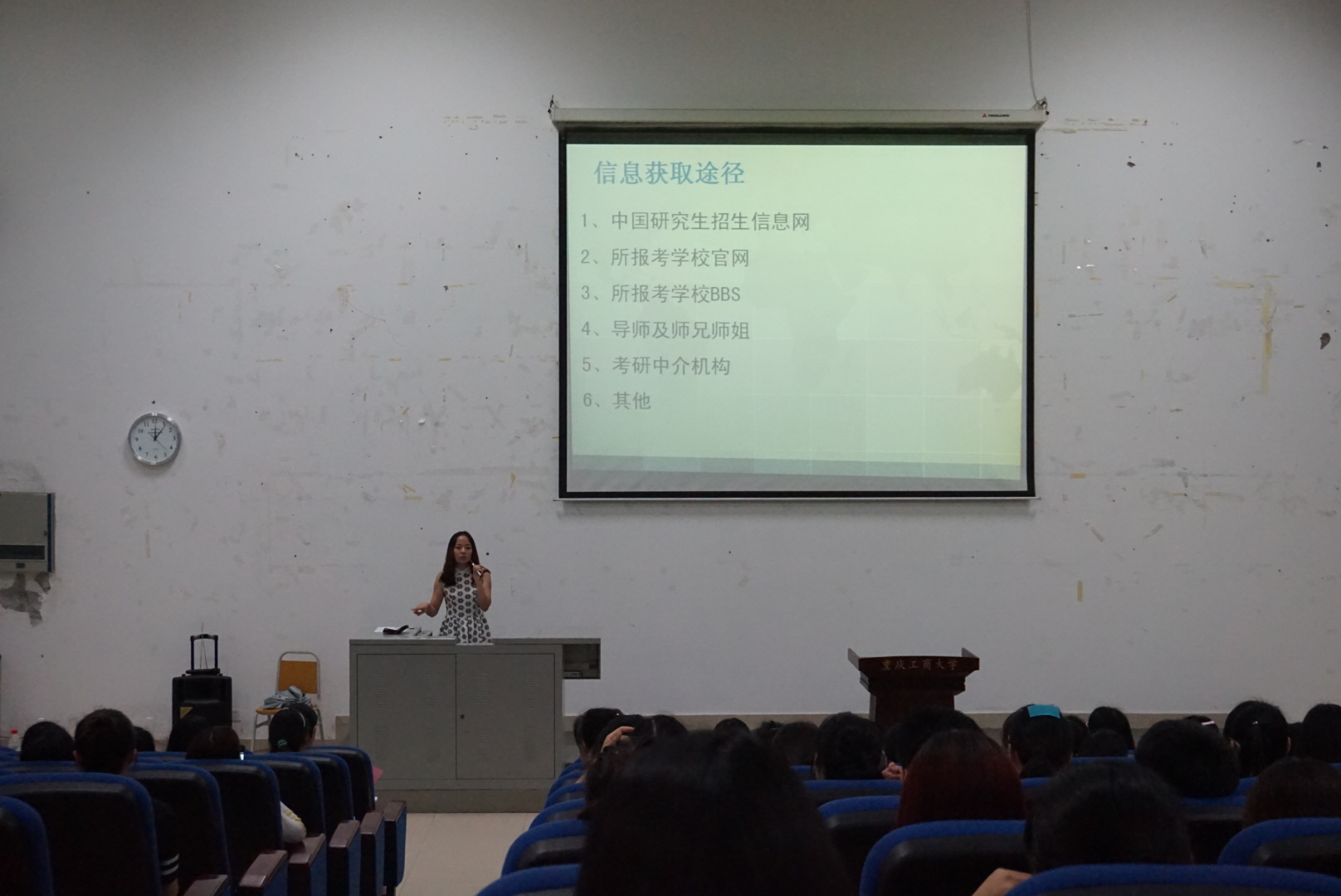 大会伊始,朱沙博士做了考研动员报告,鼓励大家树立目标、不懈奋斗。2012年考入中国人民大学税务专业的张晓玲学姐,从专业硕士的角度,诠释了专硕的考试要求、复习重点及方法,正如学姐所说,“学习没有捷径,但学习是人生进步的捷径”。重庆大学学术硕士刘春兰学姐阐述了学硕的考试范围、复习要领及注意事项。金卓文学姐从自身经历出发畅谈了工作后考研的重重阻碍,并鼓励同学们抓住学习的黄金时段不懈拼搏。陈红学姐从本土考生的角度,分享了自己考研的优势、良好的心态及意外的收获。李爽学姐则道明了跨专业考研的辛酸。五位学姐给在场的待考研学子带来了一场开启考研之路的盛宴,博得了在场观众的阵阵掌声。