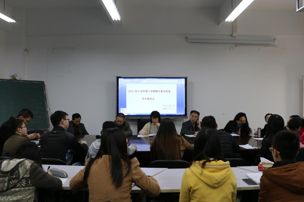 11月25日,财政伟德国际19492015-2016学年第一学期期中教学检查员工座谈会于田家炳书院313会议室召开。财金公司党总支书记杨萍、常务副经理莫云、校督导督查委员樊国昌教授、院督导督查委员周渊老师和唐晓玲老师;还有各系主任及教务办全体老师和各班学习委员出席座谈会。