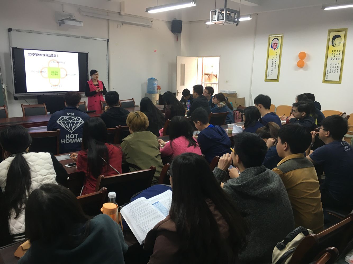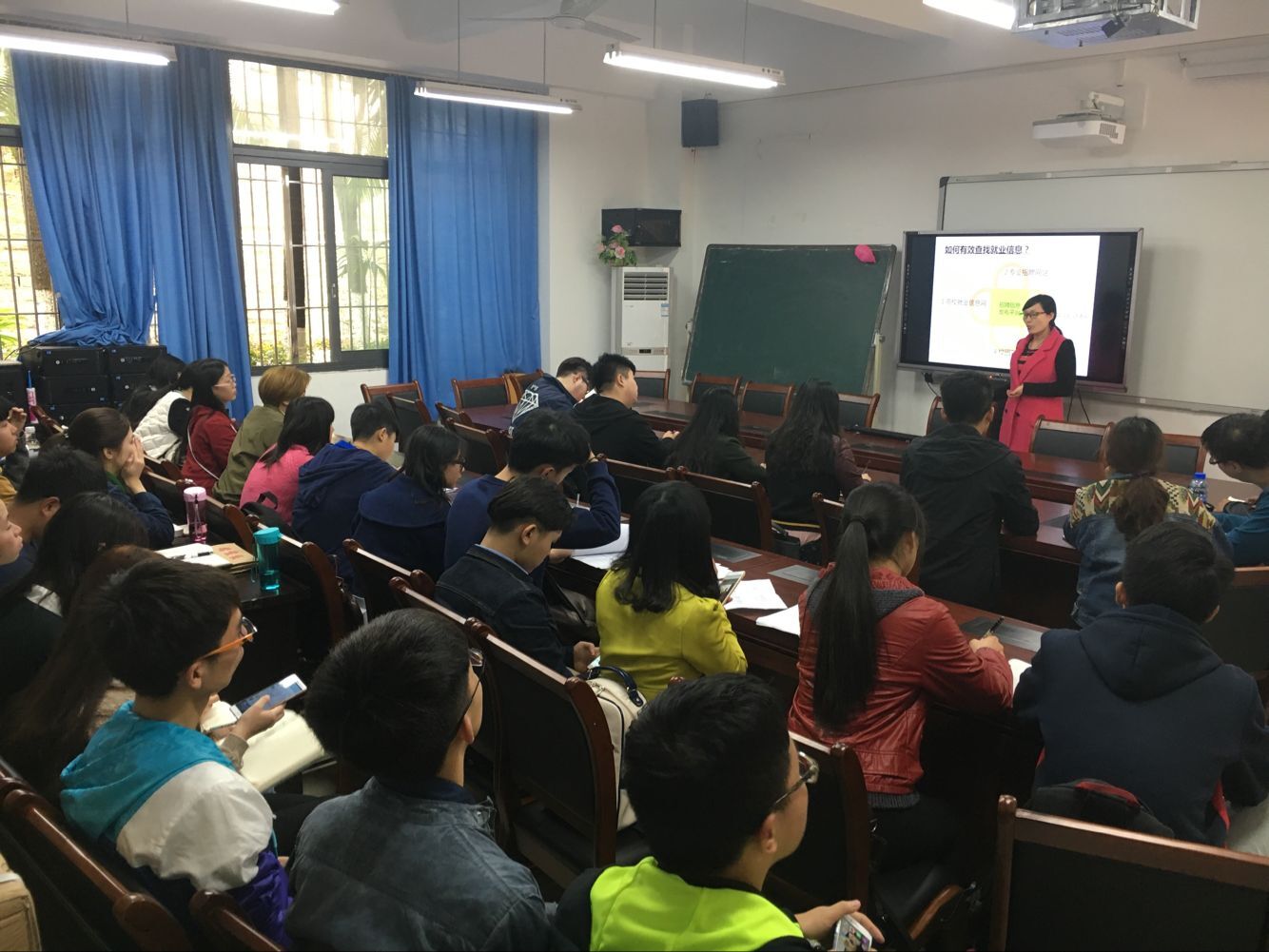 培训伊始,兰丽娟老师从为员工发展的角度,娓娓讲述了就业的相关知识。首先老师就高校就业信息网、应届生求职网、大街网、中华英才网、汇博人才网等就业网站做了简单分析,并详细介绍了相关网站的具体情况,加深了同学们对求职网站的认识。不仅如此,为了使同学们早日与社会接轨,兰丽娟老师还向大家介绍推荐了适合财金学院学子实习的单位,如兴业银行等。条条大路通罗马,兰丽娟老师也为想考公务员的同学们讲述了一些有关考试的一些具体事项,并推荐了“华图”、“中公”两家培训机构供同学们选择。在同学们的深思中。她又向大家介绍了选调生考试,党员公务员以及事业单位考试的相关情况。为了让同学们更好的适应工作情况,兰丽娟老师着重强调了在同学们收到招聘信息之后,不能太过急躁,应当对企业进行一番深入了解,将职位与自身的实际情况相匹配之后,再做决定。