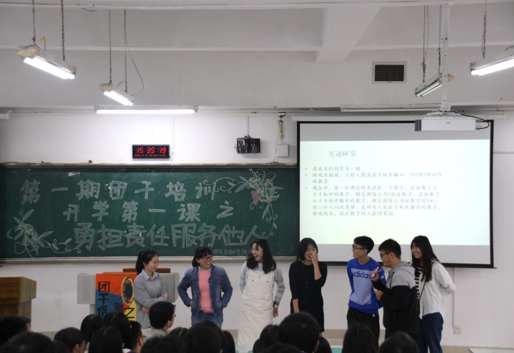 培训以“学院知多少”、“勇担责任,服务他人”为主题,由刘代成书记和徐阔老师为各位团干进行指导培训。徐阔老师从学院相关信息、学院与班团工作的联系、财政伟德国际1949分团委员工会、员工干部素质要求等方面给大家做了介绍,并提出了“既要把工作负责好,也要把学业兼顾好”的殷切希望。随后刘代成书记发表讲话,他从“团队凝聚力”入手,要求团干做事不要有私心,不能太感情用事。他强调责任意识和服务意识是作为一名团干部应具备的基本素质。最后同学们进行自我介绍,相互交流,加强了各班团之间