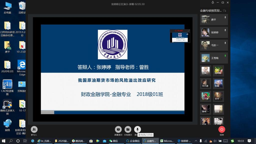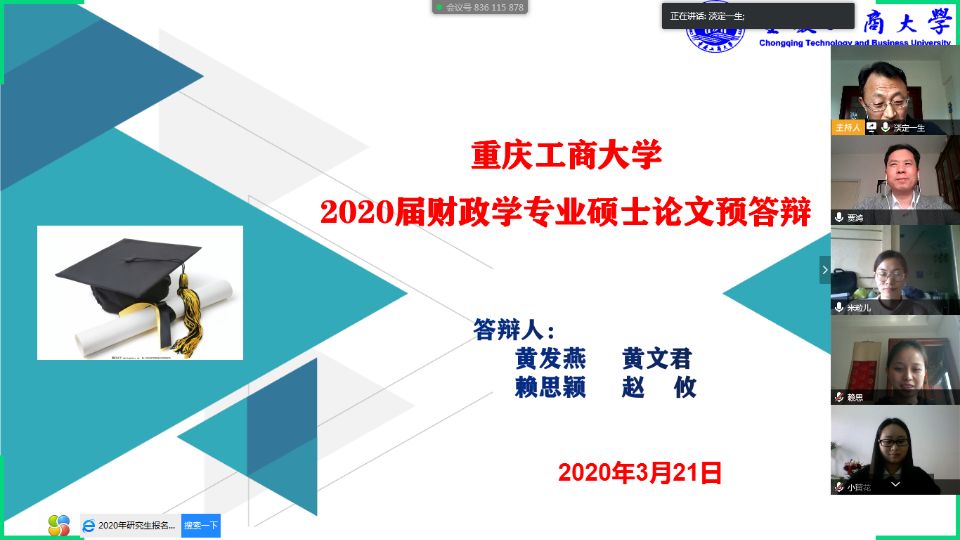 本次预答辩设财政学(1组)、金融学硕(2组),金融专硕(6组),共9组答辩会场,在岗在校的所有硕士生导师都参与了本次预答辩。财政学组由尚可文导师主持,金融学硕组由谭湘渝和骆志芳导师主持,金融专硕组由毛跃一、靳景玉、曾胜、许世琴、王兰和文传浩等6名导师主持。为保障线上预答辩的顺利进行,答辩员工认真准备预答辩报告PPT,答辩专家提前则2天审阅了员工提交的论文电子版并整理出了论文相关评阅意见,同时指定好每组的联络人,为正式预答辩做好准备工作。