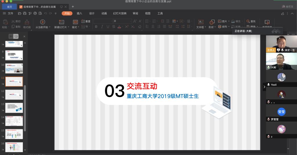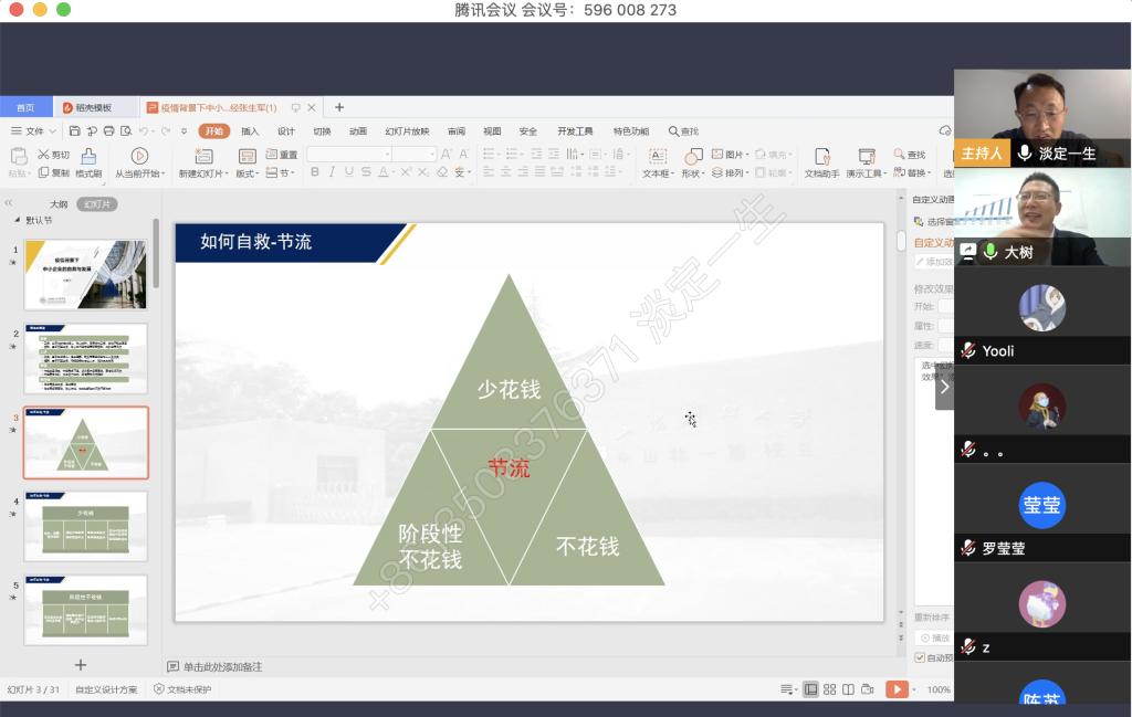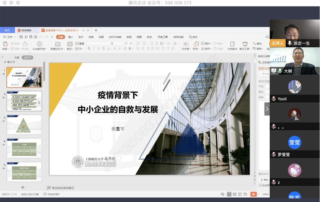 4月9日晚上,公司税务硕士教育中心通过腾讯会议成功举办了本年度第一次南山税务沙龙——疫情背景下中小企业的自救与发展。本次沙龙由伟德国际1949始于英国尚可文教授主持,特邀请迅驰车业江苏有限公司副总裁、上海财经大学硕士生导师张生军博士主讲,公司2019级税务硕士研究生参加了沙龙。
