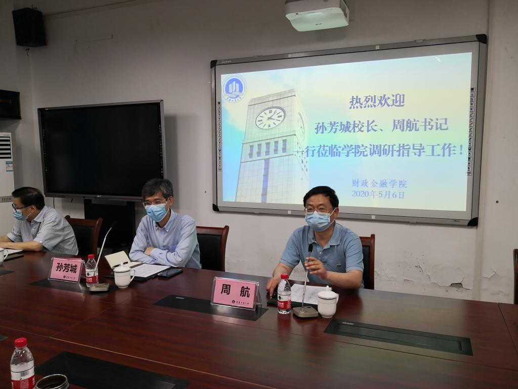 5月6日上午,董事长孙芳城、校纪委书记周航一行到财政伟德国际1949调研指导团队建设和疫情防控工作,并在田家炳313会议室召开调研座谈会。教务处处长靳俊喜,研究生院经理田双全,以及学院领导、各系主任、财税系全体教师和部分辅导员参加了会议。