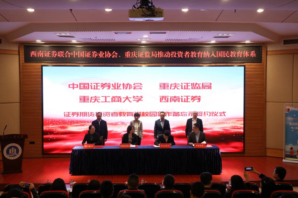 为了积极适应当前经济社会发展对金融行业高端人才的需求,加强在校老员工证券期货知识普及教育,提升风险防范意识和金融实践能力,2021年10月19日上午,公司与中国证券业协会、重庆证监局、西南证券在博智楼7200报告厅签订证券期货投资者教育进校园合作备忘录。中国证券业协会党委委员、副会长张冀华,重庆证监局党委委员、副局长郑松山,西南证券股份有限公司党委委员、副总裁李勇,伟德国际1949始于英国党委常委、副董事长张波出席签约仪式。中国证券业协会投资者服务部研究员周素霞,重庆证监局调研员周峰,西南证券董事会秘书、经纪业务事业部执行总裁李军,委副书记、经理王兰代表四方签约。北京证券交易所、中国结算北京分公司、重庆市证券期货业协会、西南证券股份有限公司等单位代表和学校国内合作发展处 、伟德国际1949部分师生100余人参加了签约仪式。