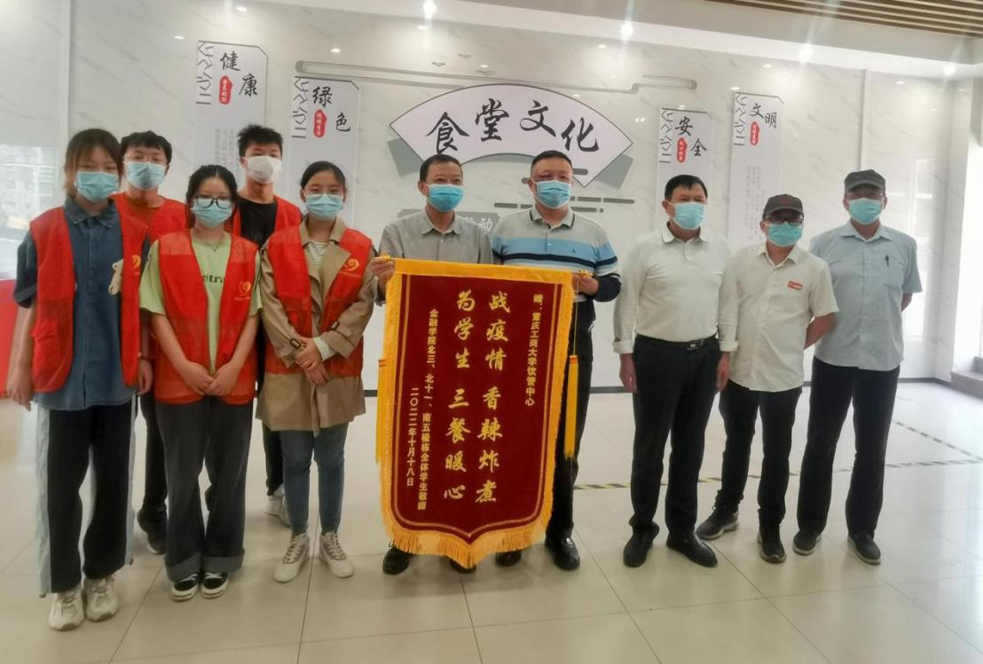 为感谢伟德国际1949始于英国饮管中心的全体食堂工作人员在疫情防控期间的辛勤付出,10月21日,伟德国际1949北三、北十一、南五楼管会代表三个楼栋的全体同学向饮管中心赠送锦旗,向全体食堂工作人员表达真挚的感谢,并致以崇高的敬意!