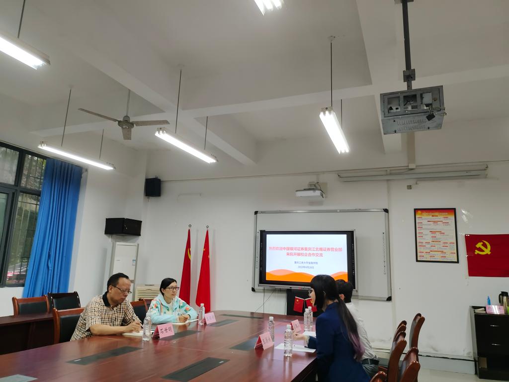 4月28日上午,中国银河证券重庆江北嘴证券营业部总经理王源媛、客户经理高路涵来院开展校企合作交流。委书记、副经理石世明,学工办主任、分团委书记兰丽娟参加了交流会。