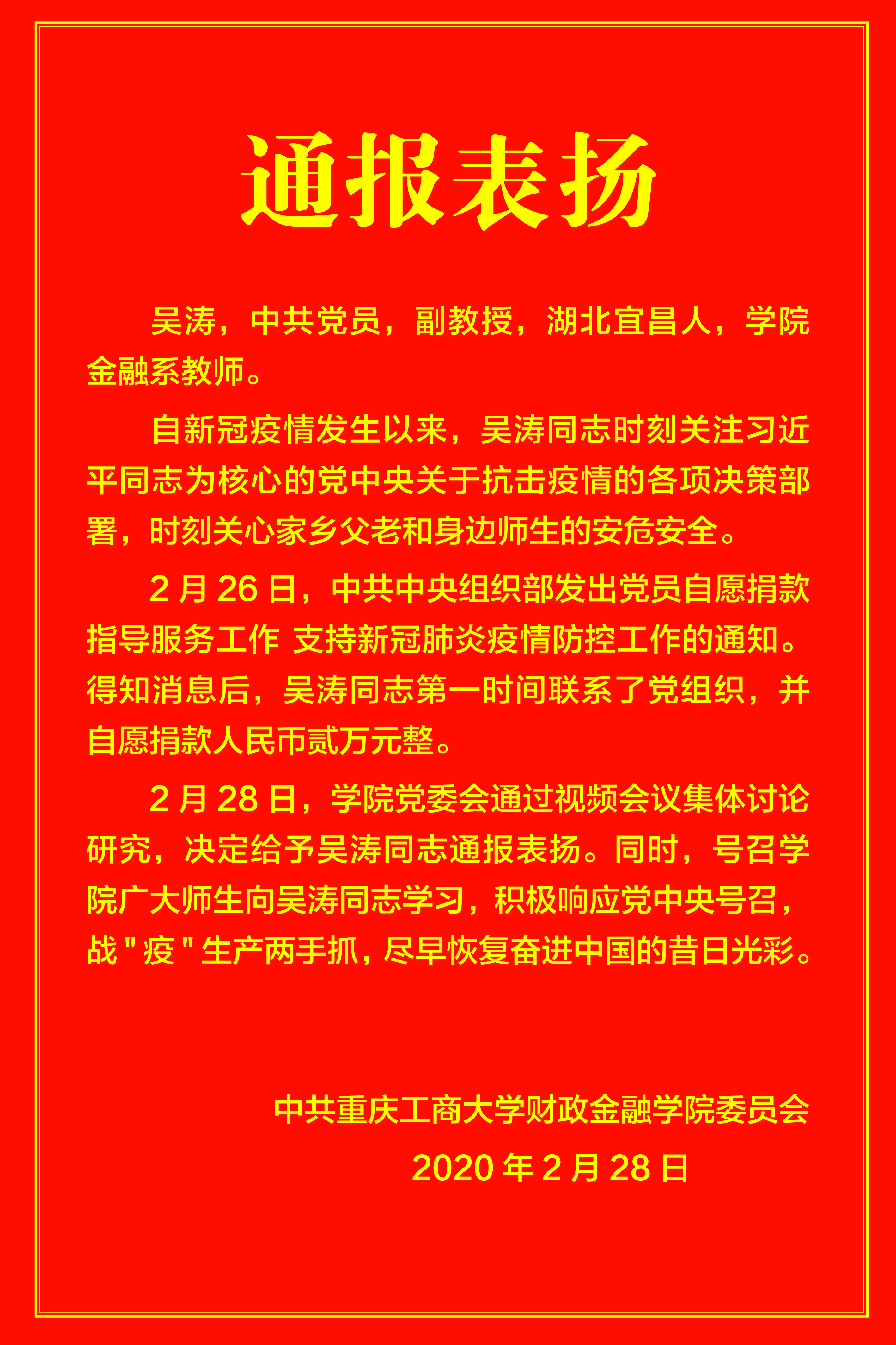 2月28日,公司党委会通过视频会议集体讨论研究,决定给予吴涛同志通报表扬。同时,号召学院广大师生向吴涛同志学习,积极响应党中央号召,战"疫"生产两手抓,尽早恢复奋进中国的昔日光彩。