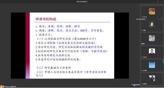杨叶红博士以自己申请书为例,通过全面细致的分析,分享了高质量申请书撰写的经验,并从撰写基金申报书常见误区、难点、到写申报书注意事项及修改申报书、立项依据、研究内容等方面为教师们申请基金提出切实可行的建议。杨博士的分享得到了与会老师的赞誉和充分肯定,拓宽了大家学术视野,增长了学术研究的经验和能力。