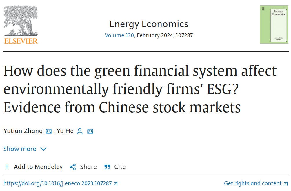 近日,公司硕士研究生张雨天在导师贺渝的指导下,为环境金融政策对ESG的影响研究提供了新的证据,并在国际学术期刊《Energy Economics》上发表了题为“How does the green financial system affect environmentally friendly firms' ESG? Evidence from Chinese stock markets”(绿色金融体系如何影响环保型企业的ESG——来自中国证券市场的证据)的学术论文(https://doi.org/10.1016/j.eneco.2023.107287)。