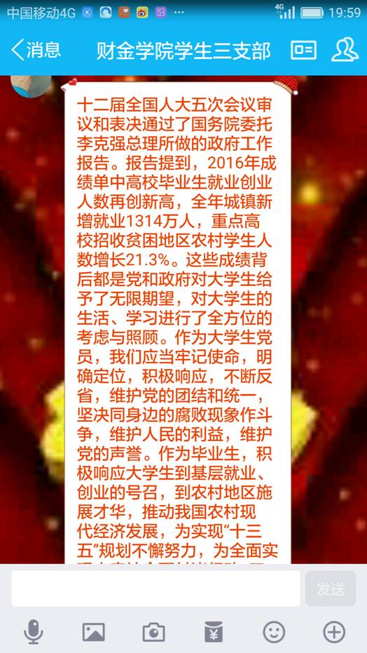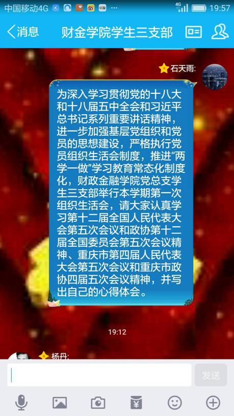 本次组织生活会以线上方式进行,2017年3月31日晚7点,财政伟德国际1949员工三支部的同志们准时聚集在QQ群上。石天雨同志主持了本次会议,他首先上传了本次会议内容,包括了第十二届全国人民代表大会第五次会议和政协第十二届全国委员会第五次会议精神、重庆市第四届人民代表大会第五次会议和重庆市政协四届五次会议精神有关的文件让大家学习并发表自己的观点。