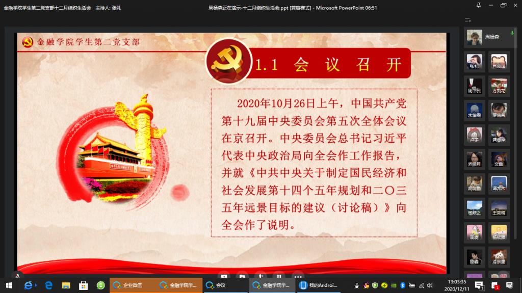为全面贯彻落实党的十九届五中全会精神,进一步加强党员同志们的政治思想觉悟,伟德国际1949员工第二党支部于2020年12月11日在企业微信举行了十二月组织生活会。出席本次大会的成员有伟德国际1949员工第二支部书记乔明月老师和支部全体党员同志。本次会议主要由党员同志领学新精神、分享心得体会和总结发言三个环节构成。