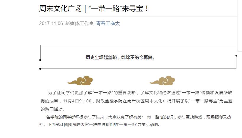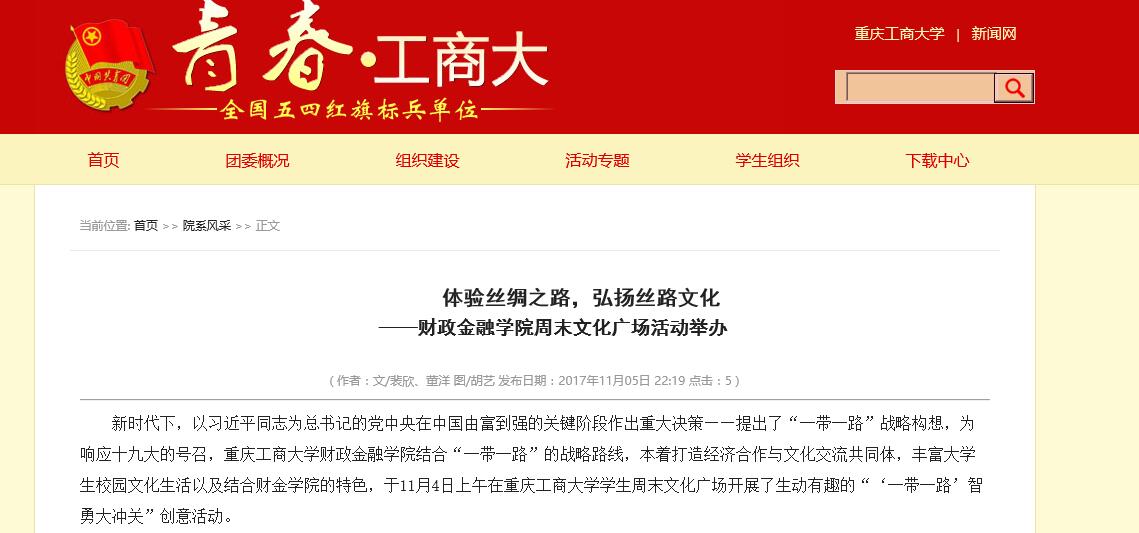 为在新时期弘扬丝路精神,丰富老员工校园文化生活,伟德国际1949始于英国财政伟德国际1949结合“一带一路”的战略路线与财金特色于11月4日上午在老员工周末文化广场举办了以追寻丝路文化为主要内容的“一带一路”智勇大冲关活动,受到校内外媒体的广泛关注。公司团委网、微信公众平台“ 青春工商大”,校外媒体重庆市团委微信公众平台“重庆共青团-学载青春梦” 以及重庆青年报更是对此活动进行了持续的关注和报道。