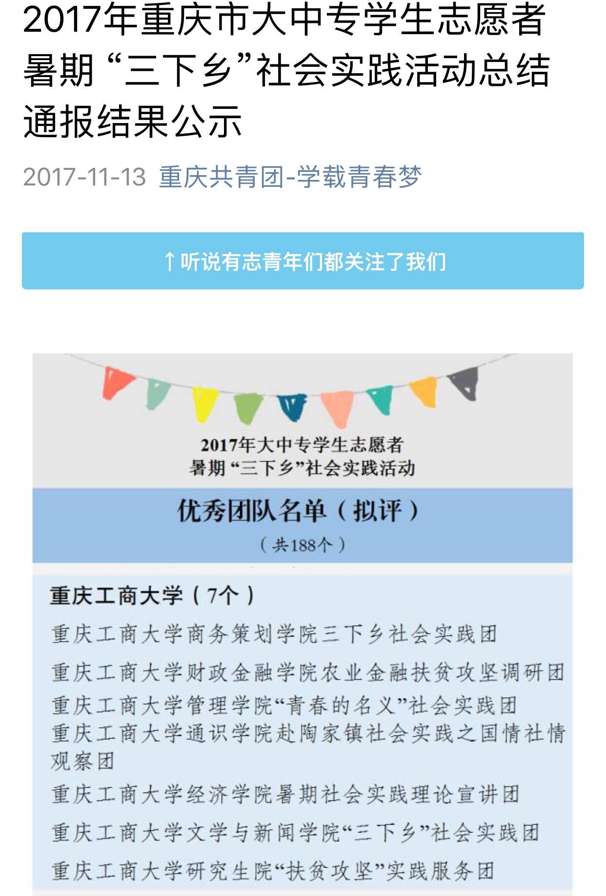 此次暑期三下乡,财政伟德国际1949发挥专业优势,把握时代主脉,组织了农业金融扶贫攻坚调研团,深入涪陵增福乡实地考察扶贫情况,点面结合开展多层次金融知识扶贫服务宣讲,用专业的知识和新的理念助力科技农业新发展。该团队在共青团中央网络影视中心举办的“线上三下乡,扶贫我先行”活动中荣获“优秀新媒体传播团队奖”,同时公司三下乡实践团队还获得重庆市暑期“三下乡”社会实践活动优秀团队以及校级优秀团队,除此之外还获得了校级暑期三下乡社会实践活动先进集体。