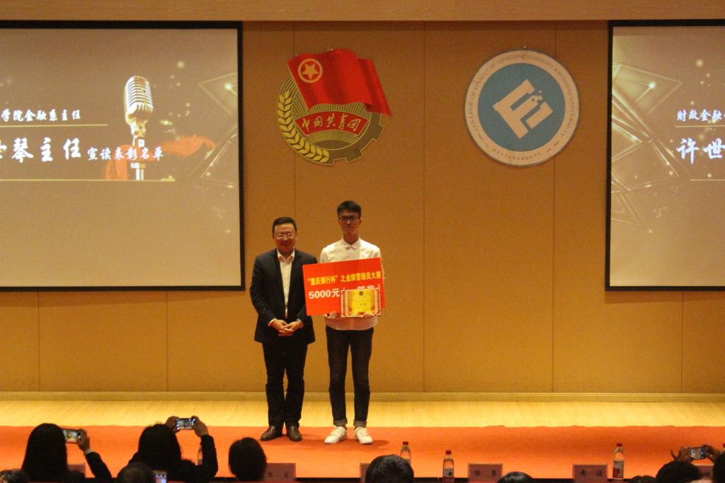 财金舞蹈队以婀娜曼妙的舞姿为大会拉开了帷幕,与会人员一同在总结视频中回顾选手们一路走来的优秀表现与酸甜苦辣,三个月的营销历程历历在目。随后,公司党委副书记黄谦发表讲话,表达了对重庆银行以及学院各领导大力支持的感谢,祝贺参赛选手在比赛中取得优异成绩,他还强调此类学科竞赛为学院金融专业的长足发展有重要意义;随后,陆勇先生在发言中肯定了重庆银行与财金学院架构实践桥梁的意义并对各参赛选手在重庆银行各营业网点的优异表现给予高度评价,感谢他们的辛勤付出为重庆银行年度业绩奠定了良好基础。在激动人心的颁奖环节,况娴、周悦等10名同学获得优秀奖;曾永家左、秦雨凡、蔡进获得三等奖;李璨婷、幸夕获得二等奖;杜朝阳凭借出众的营销技能和坚持不懈的精神勇夺大赛冠军。