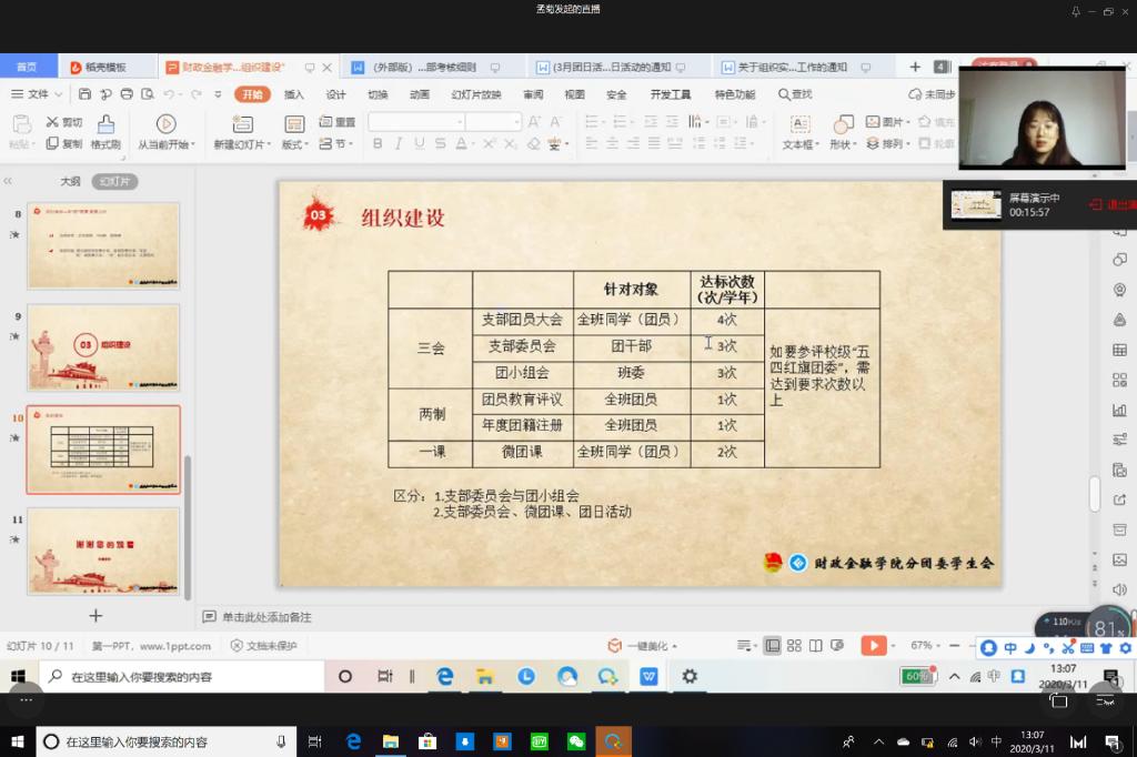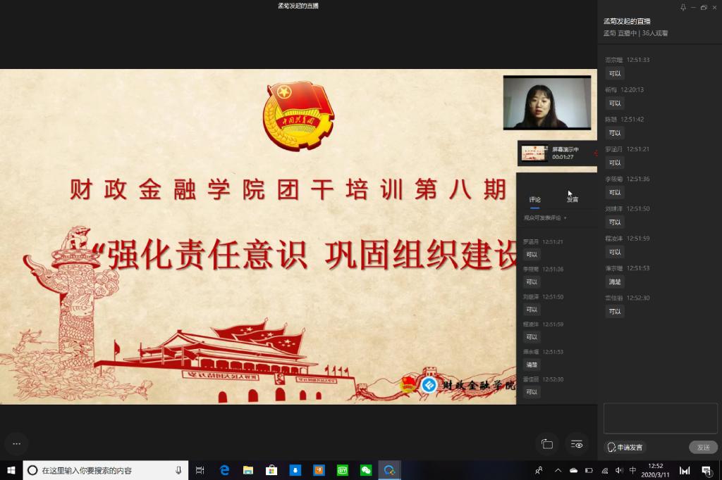 受疫情影响,财政伟德国际1949于2020年3月11日在企业微信线上平台成功开展主题为“强化责任意识,巩固组织建设”的第八期团干培训活动。17、18级各班以及19CFA的团支书参与了此次培训活动。