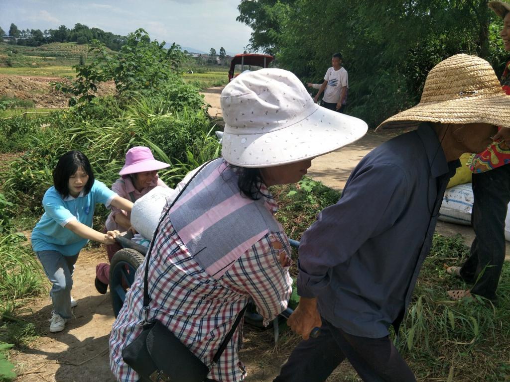 服务团队成员来到重庆市垫江县沙坪镇白杨村村中进行了脱贫攻坚战的“扶智”的访谈。当日,通过村民的带领下,服务团队成员来到了他们劳作的地点,烈日炎炎,稻谷金黄,当地正值农忙。通过访谈,服务团队成员了解到村里修了公路,为稻谷收割机进入田地提供了方便,由以前的人力转化为了机器劳作,大大减轻了劳作强度以及辛苦程度。