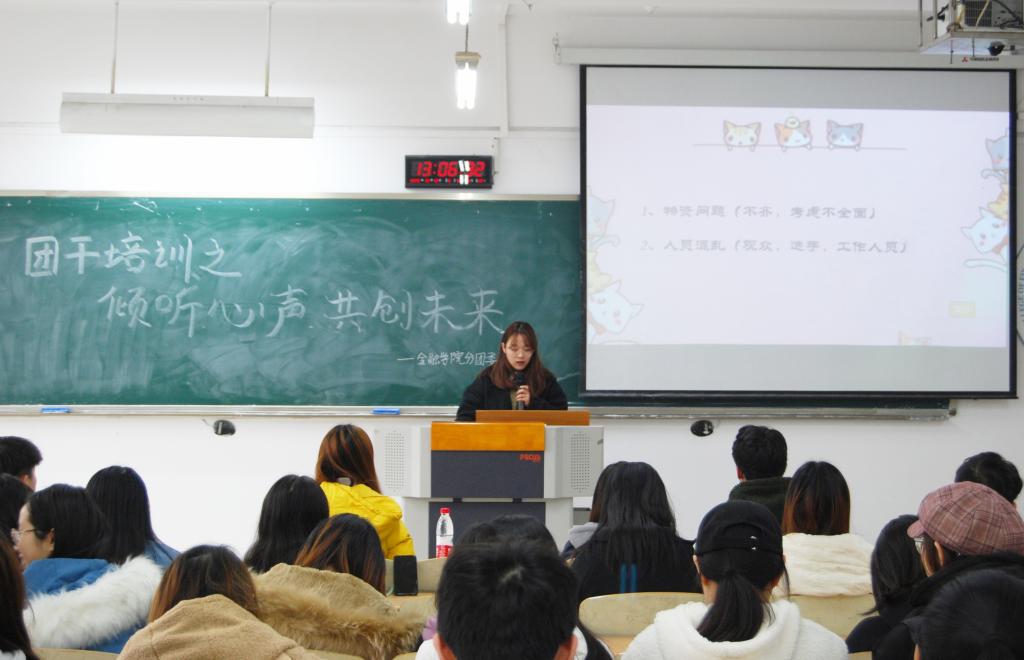 培训开始,分团委(员工)副书记田凯玉从活动的开展、员工会的运行机制、员工干部的综合素质三大板块对前期满意度问卷调查的结果进行总结分析。他提出缺点主要有:活动宣传力度不够大、范围不够广,平均参与率还不够高;部分同学表示员工会的运行不够透明,办事效率、服务态度有待加强,同时希望能举办更多团队或社会合作类、学术类交流类的活动,锻炼综合实践能力。他谈到员工会工作存在许多不足,希望部门负责人们能在今后的工作中改进,更好地服务同学。接着,组织部、学创部等部门负责人从活动开展状况、活动优缺点等多方面概述了“想把我的故事和你说”暑假社会实践分享大赛、“第十九届‘金融杯’辩论赛”等比赛。
