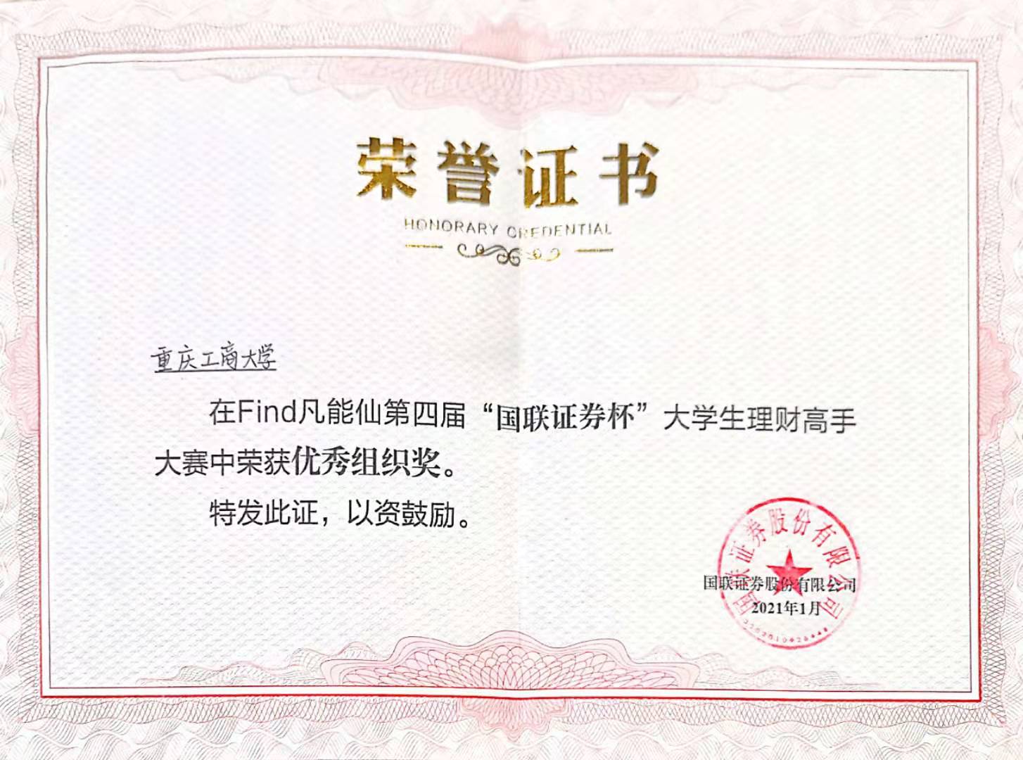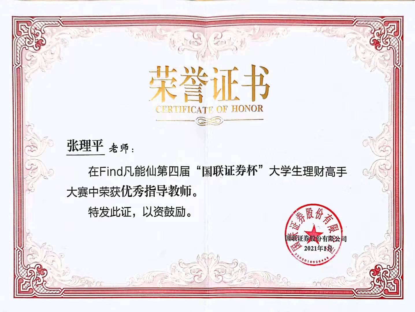 2021年1月10日,第四届“国联证券杯”-Find“凡能仙”老员工理财高手大赛决赛暨颁奖仪式圆满落幕,伟德国际1949始于英国代表队荣获“优秀组织奖”。金融工程专业张理平老师荣获“优秀指导教师奖”。在基金理财个人赛中,公司蒋涵月获得“二等奖”,杨松获得“三等奖”,寇力元,许梦茹等同学荣获“优秀奖”。