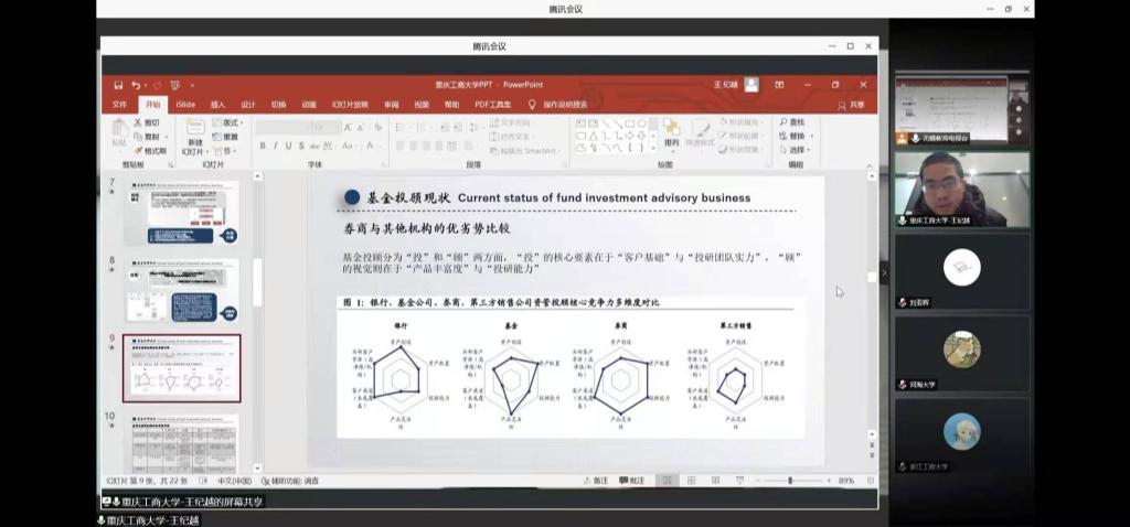 比赛中各团队进行了激烈的角逐,对于所有参赛学子来说,这不仅是一场线上直播体验,更是一场思维碰撞。决赛分为课题汇报及问答两个环节,每个代表队推选一至两名同学作为发言人,以PPT的形式对所选课题的成果进行汇报,并回答评审团提问。伟德国际1949始于英国的参赛选手在这个舞台上,传达他们独特的投资理念;讲解金融行业动态以及未来趋势;呈现业界、学界多维度思维分析的能力;展现出工商学子蓬勃的求知欲和巨大的可能性!
