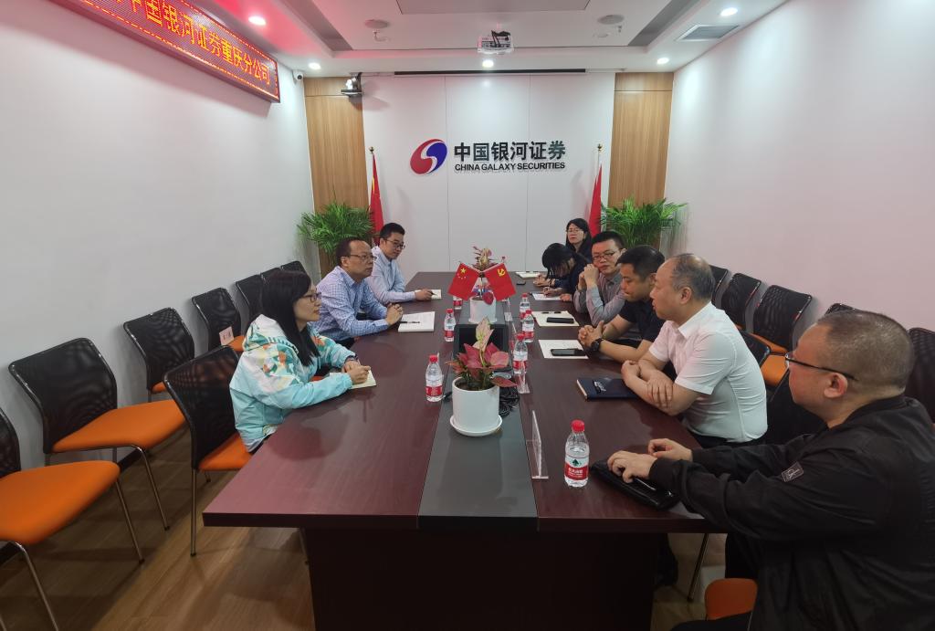 为深入开展学习贯彻习近平新时代中国特色社会主义思想主题教育,5月8日上午,委书记、副经理石世明,副经理魏琪,学工办主任、分团委书记兰丽娟等一行前往中国银河证券重庆分公司开展调查研究暨访企拓岗专项行动,探索校企深度融合新模式。中国银河证券重庆分公司党总支书记总经理周明、重庆分公司综合运营部负责人聂云、重庆民族路营业部总经理严华侨、重庆江北嘴营业部总经理王源媛、重庆分公司机构业务部负责人王楠煜、重庆万象城营业部市场营销部负责人刘珂及重庆江北嘴营业部客户经理高路涵等出席了交流会。