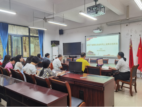 王兰同志以习近平总书记《领导干部要在改进作风上发挥示范作用》讲话精神为主要内要,结合工作实际分别从正确认识和处理人际关系,做到既有人情味又按原则办、下决心减少应酬,保持健康的工作方式和生活方式、实实在在做人做事,不搞“假大空”、 对一切腐蚀诱惑保持高度警惕,防微杜渐四个方面进行了讲述。辅以案例分析了教师如何教书育人、行政干部如何管理育人、如何以实际行动关系教师和爱护员工。