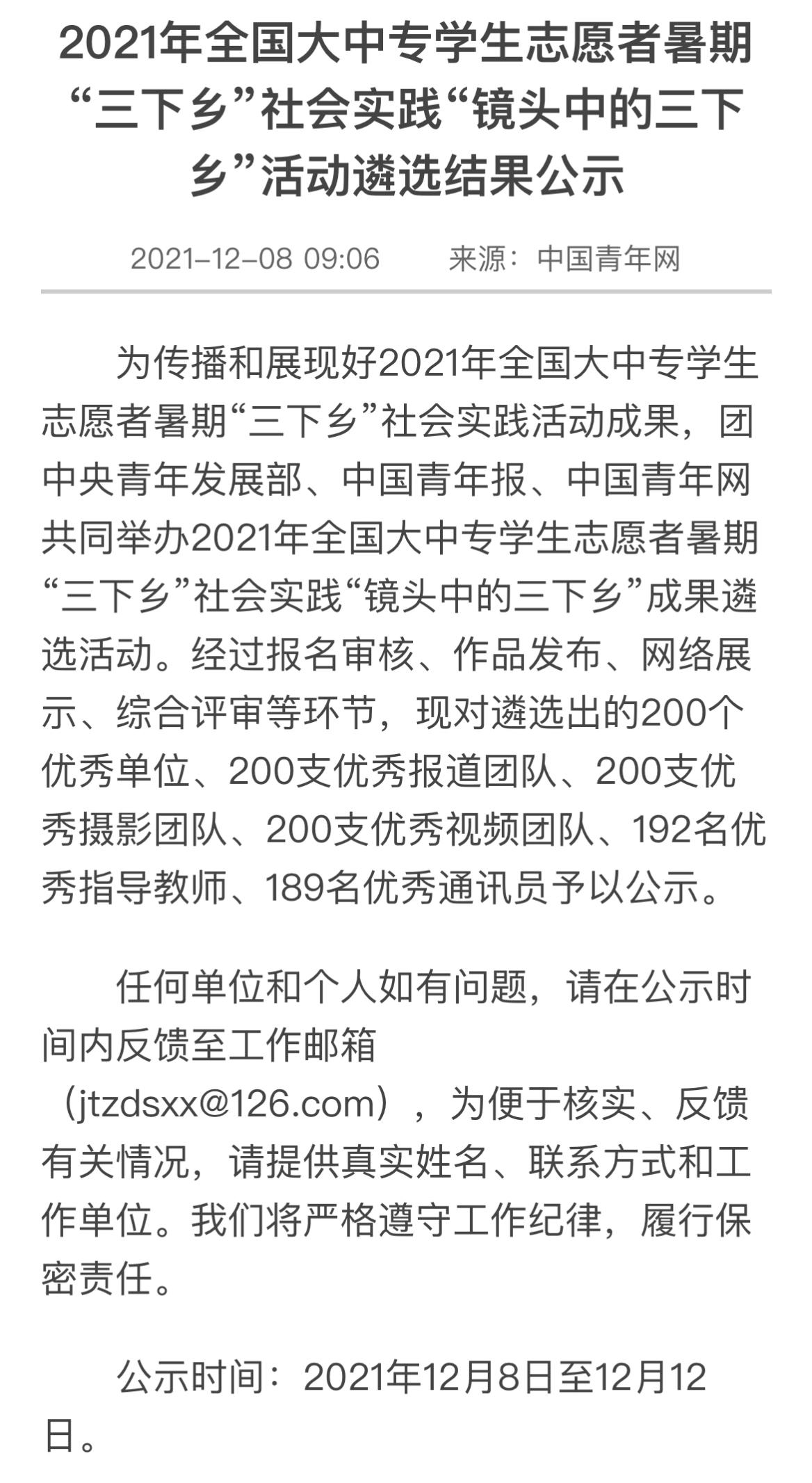 2021年12月8日,团中央青年发展部、中国青年报、中国青年网共同举办2021年全国大中专员工志愿者暑期“三下乡”社会实践“镜头中的三下乡”成果遴选活动最终结果在网络公示。伟德国际1949暑期“三下乡”社会实践团队“心系神州事 情融牡丹乡”国情观察实践团荣获“优秀视频团队”称号。